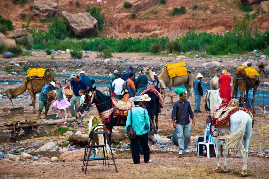 Pick up from your Hotel in Marrakech around 9 in the morning for a 1h30 drive south up the Moulay Brahim Gorges, Asni where a weekly market takes place every saturday, then to Imlil (1,740m), set in the upper level foothills of the Western High Atlas mountains, a main trailhead trekking tours to Mt Toubkal and to other valleys. Here you will leave our vehicle to take a welcome glass of mint tea in the village and meet your local guide prior to going on a hike towards the south to the Berber village of Aroumd (1,843m), passing the hamlets of ait souka, Targa Imoula, up and down the stark slopes, the jagged Western High Atlas peaks of the Toubkal Massif before us - Jbels Aguelzim (3,547m), Aksouâl (3,847m) and the Adrar Adj (3,122m) watching us all the way.. The trek then continues until the stop for lunch which will be served at a guesthouse in Aroumd village. After lunch you set off back down the other side of the valley back to Imlil and the return trip to Marrakech. Drop off at your Hotel.
