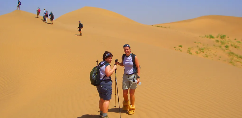 In this tour, we trek 105 km at the beginnings of the Sahara desert, close to the border with Algeria. We will pass through the valley of the Draa, the pre-desert of Saghro, and the dunes of Chegaga. We travel on foot and camels transport our luggage.