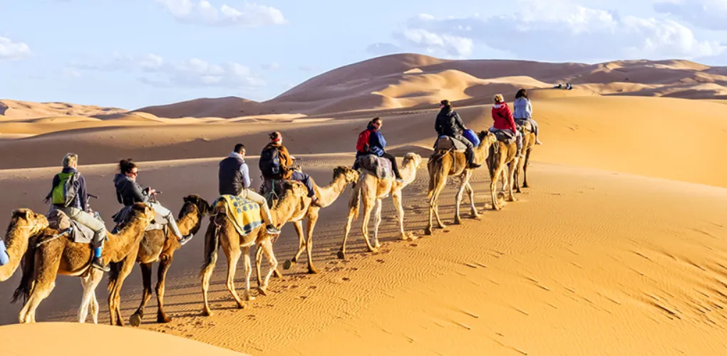 We take a scenic drive across the High Atlas Mountains to Ouarzazate and then Zagora. It takes almost 8 hours driving, passing along date-palm oases, Berber villages, and incredible landscapes. In Zagora we leave the minibus and take a more appropriate vehicle that will take us to Faija. There we meet the camels and their cameleers.