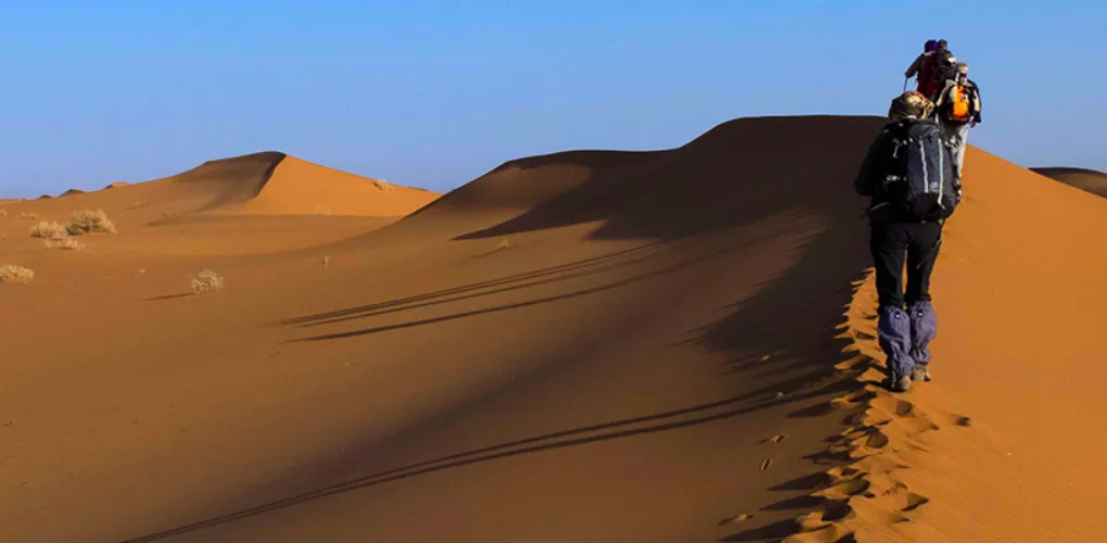 In this tour, we trek 105 km at the beginnings of the Sahara desert, close to the border with Algeria. We will pass through the valley of the Draa, the pre-desert of Saghro, and the dunes of Chegaga. We travel on foot and camels transport our luggage.